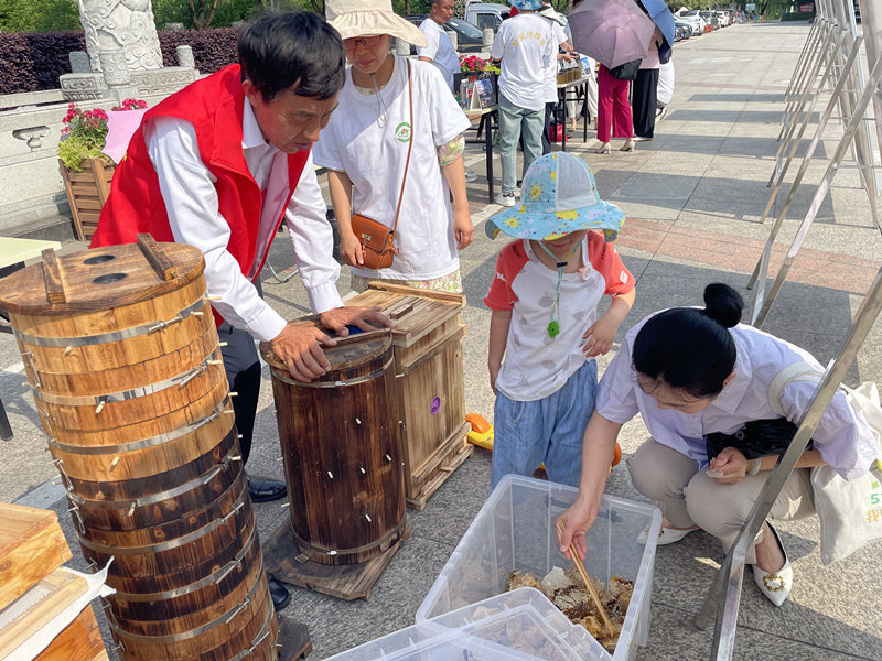 本次活动引得不少群众驻足围观,附近散步、晨练和过路的群众被一块块生动的宣传画、整齐摆放的蜂箱和新鲜的蜂蜜吸引过来,并饶有兴致的向现场工作人员询问起养蜂和蜂蜜相关的问题。现场的中蜂协会技术人员和合作社养殖人员耐心的对群众一一解答,同时邀请现场群众对“殷家坪蜂蜜”蜜脾和蜂蜜进行品尝。经过咨询和品尝,让不少群众对中华蜜蜂品种、养蜂方法、蜂箱种类、中蜂蜂蜜等有了系统认识。通过了解和品尝,很多市民纷纷购买了“殷家坪蜂蜜”。