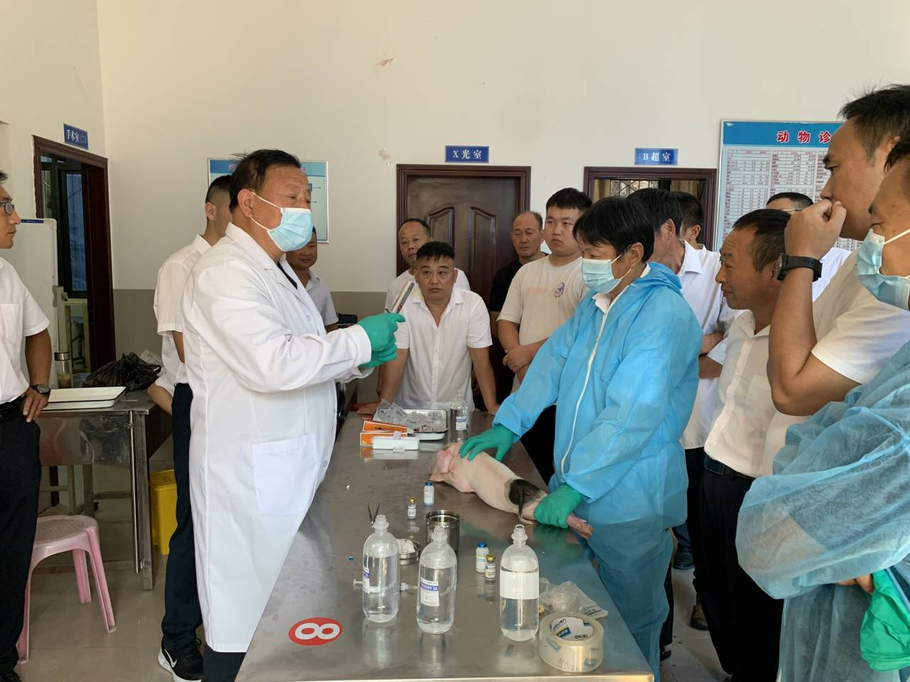 动物防疫技术实操课堂上用仔猪和家禽作为授课展示牲畜,现场演示疫苗注射工作细节、免疫部位及方式方法,日常动物疫病监测血液、棉拭子等采样部位及方式方法,以及防护服的穿脱及处置方法等。