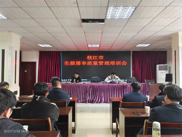 为贯彻落实《生猪屠宰质量管理规范》及省、市相关工作要求,确保全市畜禽产品不发生质量安全事故,保障我市“菜篮子”安全,近日,枝江市畜牧兽医服务中心组织开展生猪屠宰质量管理培训会,全市官方兽医、协检员、屠宰厂负责人、兽医卫生检验人员、动物经纪人共40余人参会。