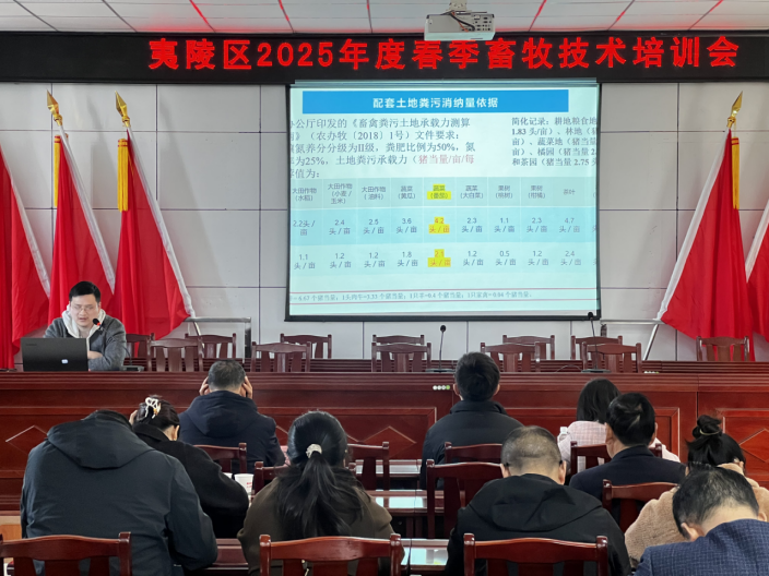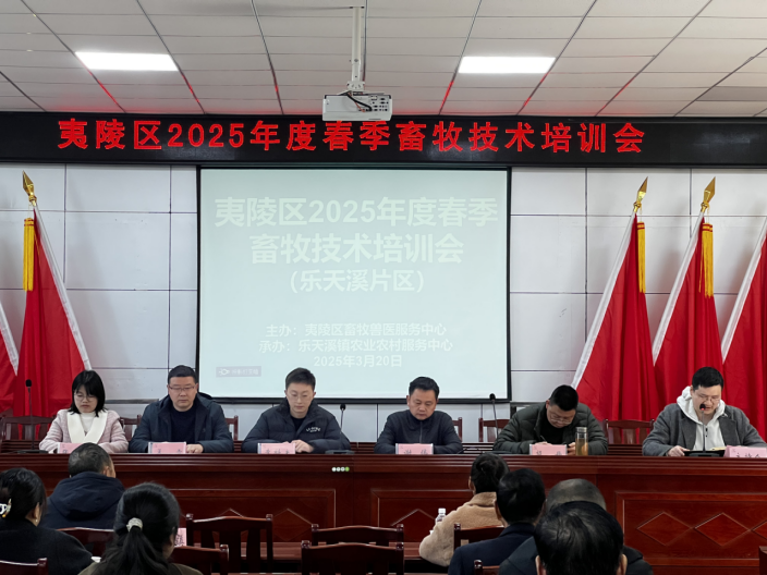 春暖花开日,培训正当时。3月20日,夷陵区畜牧兽医服务中心2025年度首场春季畜牧技术培训班在乐天镇举行,来自邓村、太平溪、三斗坪、乐天溪四个乡镇规模养殖企业负责人及绿色生态养殖户代表共计50余人参训,为春季畜牧生产蓄力赋能。