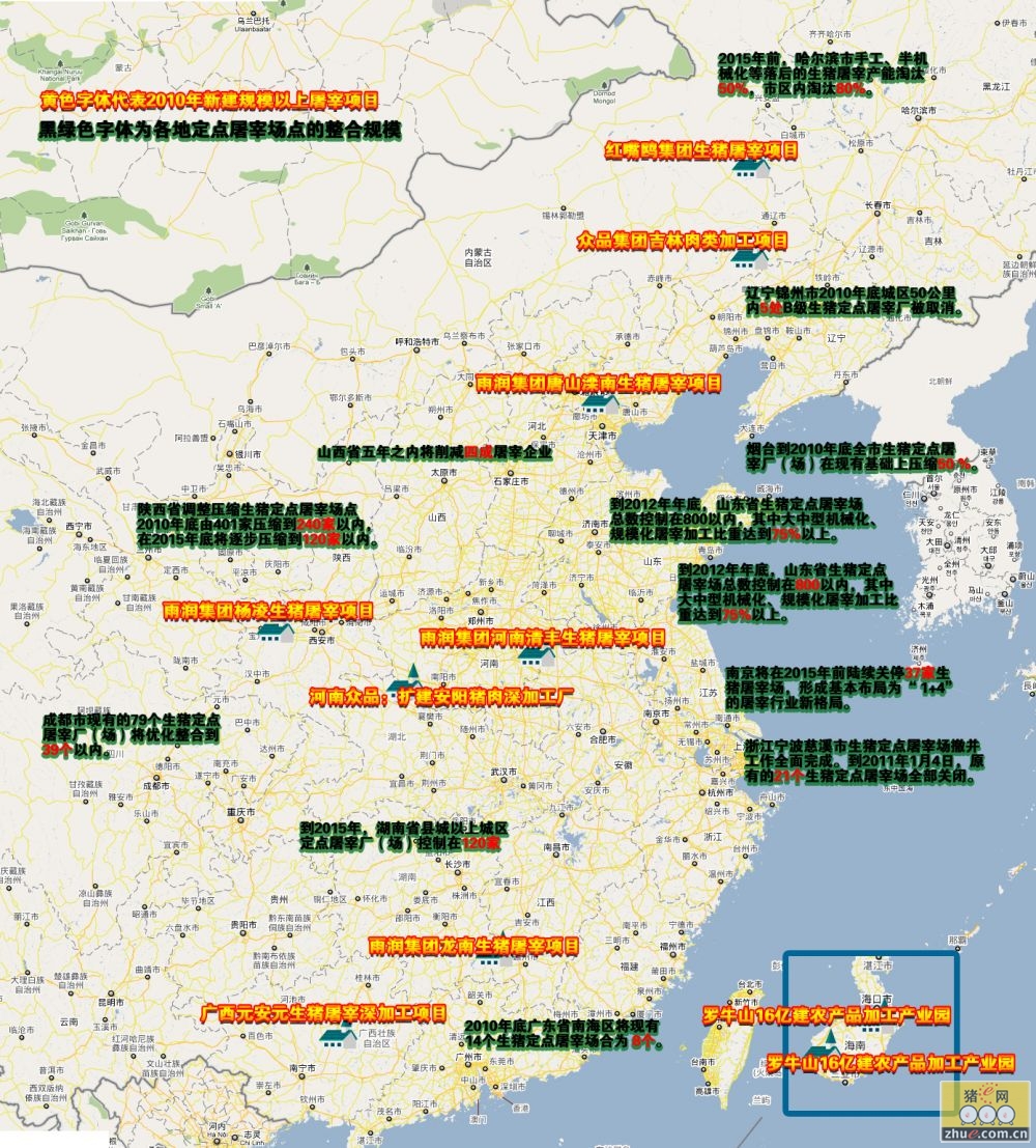 2010年新建屠宰项目及各地屠宰场整合分布图(点击查看大图) |