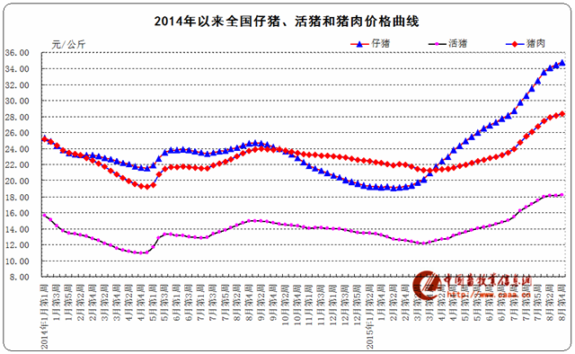 据对全国480个集贸市场畜禽产品和饲料价格定点监测,8月份第4周(采集日为8月26日)仔猪、活猪、猪肉、禽类产品、牛羊肉价格上涨,生鲜乳、玉米价格下降。