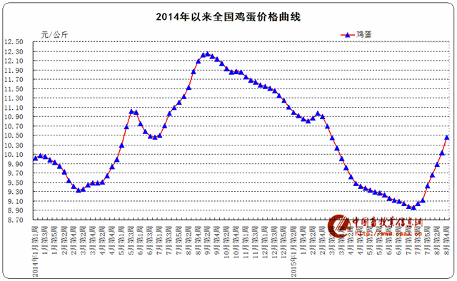 鸡蛋价格。全国鸡蛋平均价格10.46元/公斤,比前一周上涨3.3%,同比下降11.9%。河北、辽宁等10个主产省份鸡蛋平均价格9.27元/公斤,比前一周上涨5.5%,同比下降18.0%。全国活鸡平均价格19.03元/公斤,比前一周上涨0.9%,同比上涨1.6%;白条鸡平均价格19.22元/公斤,比前一周上涨0.6%,同比上涨1.9%。商品代蛋雏鸡平均价格3.18元/只,比前一周上涨1.6%,同比下降2.8%;商品代肉雏鸡平均价格2.75元/只,比前一周下降0.7%,同比下降13.5%。
