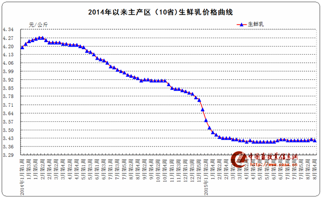 生鲜乳价格。内蒙古、河北等10个奶牛主产省(区)生鲜乳平均价格3.41元/公斤,比前一周下降0.3%,同比下降13.5%。