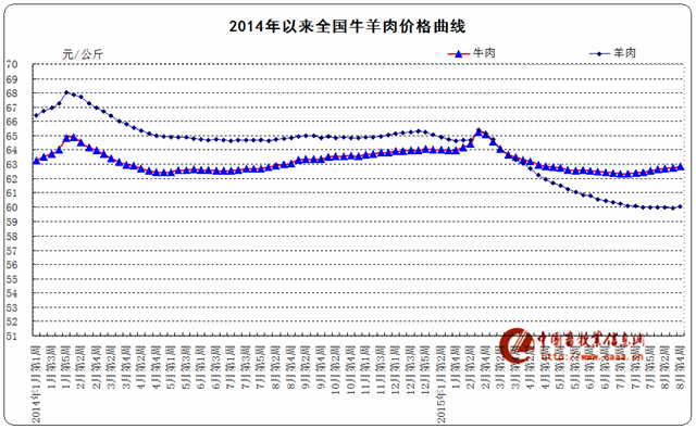 牛羊肉价格。全国牛肉平均价格62.85/公斤,比前一周上涨0.1%,同比下降0.3%。河北、辽宁、吉林、山东和河南等主产省份牛肉平均价格56.24元/公斤,与前一周持平;上海、浙江、福建、广东和江苏等省份平均价格73.44元/公斤,比前一周上涨0.1%。全国羊肉平均价格60.03元/公斤,比前一周上涨0.1%,同比下降7.4%。河北、内蒙古、山东、河南和新疆等主产省份羊肉平均价格53.20元/公斤,与前一周持平;上海、浙江、福建、江西和广东等省份平均价格69.72元/公斤,比前一周上涨0.2%。