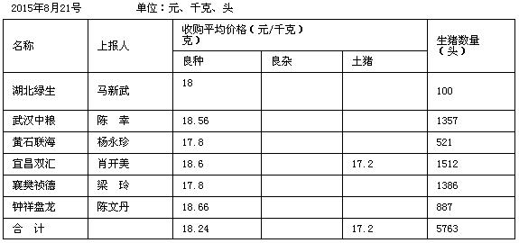 2015年8月21日湖北省生猪收购价格